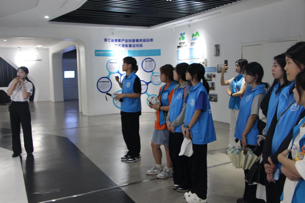 实践团首站来到60·60建德航空小镇展示厅。在讲解员的引导下,成员们直观了解了小镇的“前世今生”与产业内核。从飞机制造、飞行培训到航空旅游,小镇的通航产业链条完整,展现了新兴产业如何带动当地就业、科技研发和经济升级。机场建设、航空服务等具体规划的落地实施,让成员们深刻感受到了航空产业的蓬勃生机。