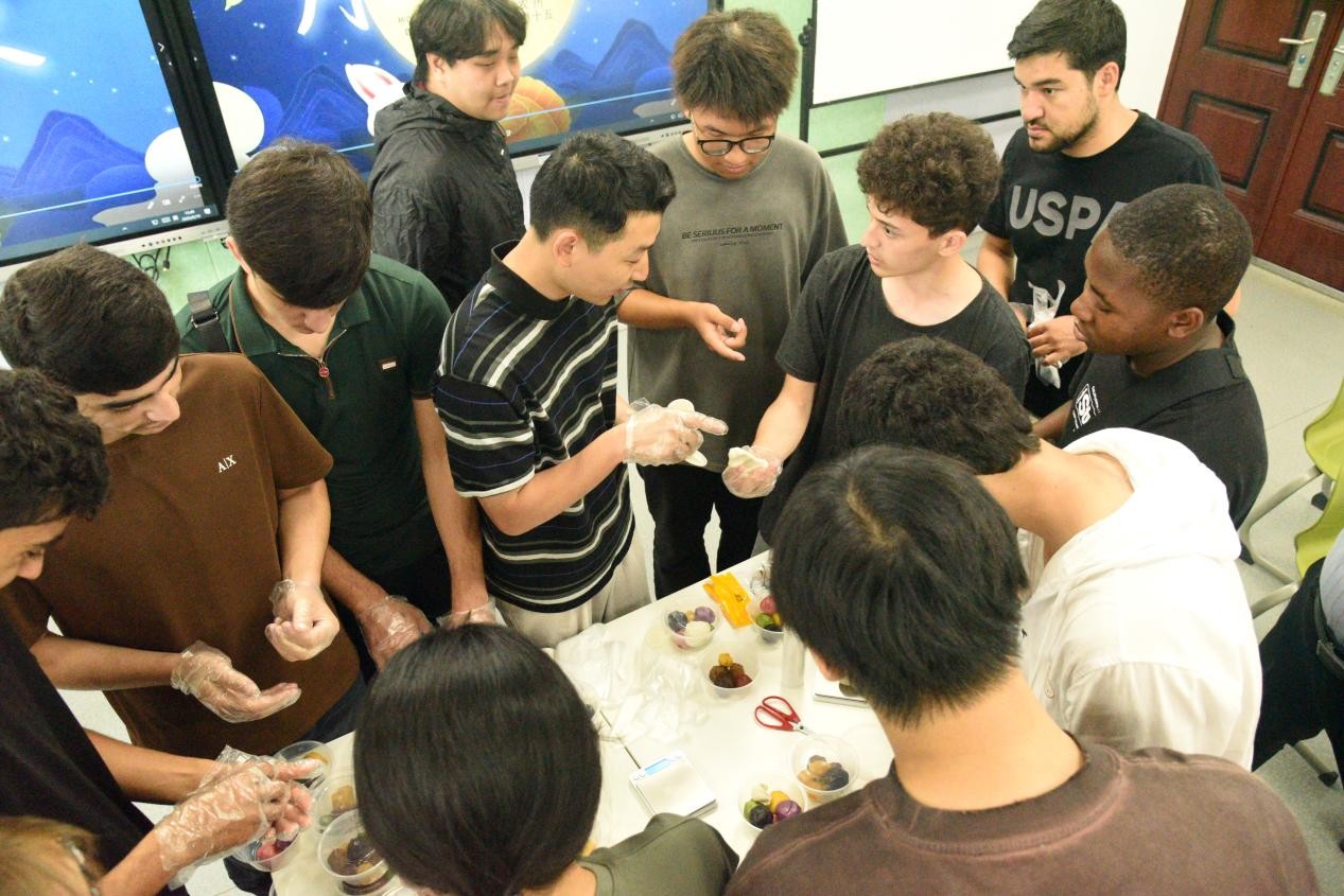 活动中,一系列关于中秋节起源、习俗与文化内涵的经典故事,唤起了在场中外学子对故乡的深切思念,也让大家更加深入地理解了中秋节所承载的团圆寓意与人文价值。随后的月饼制作体验环节,进一步拉近了彼此的距离。中外学生携手参与,在手作过程中体验合作与创造的乐趣。大家一边制作月饼,一边分享各自的感受与故事,现场不仅弥漫着月饼的香甜,更充盈着学院大家庭的温暖与融洽。一个个精心成型的月饼,既寄托着美好的节日祝愿,也象征着因奇妙缘分而相聚在此的“团圆”时刻。