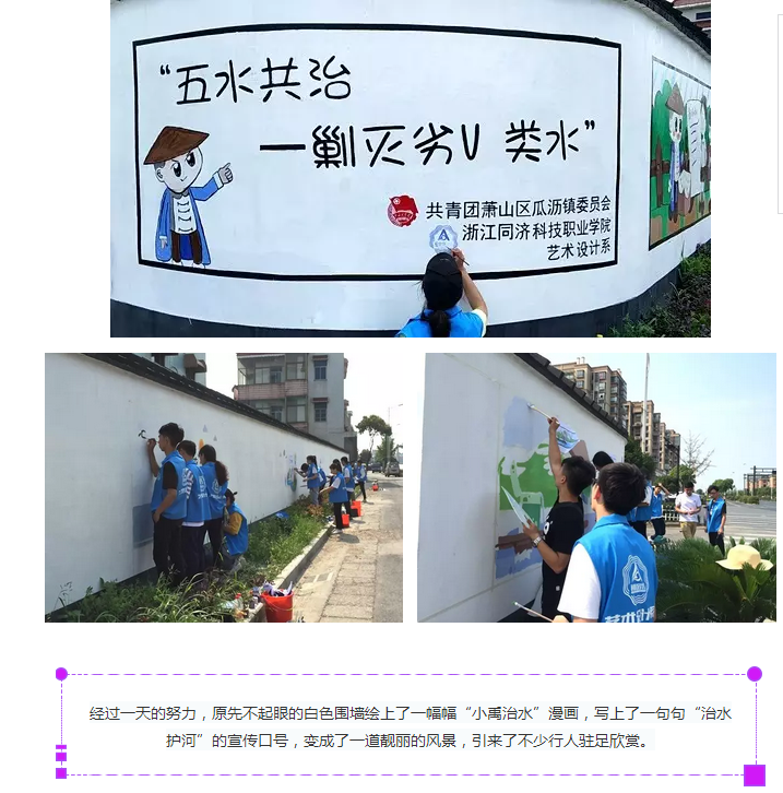 6月3日,艺设系30余名学生在团总支书记黄君的带领下,赴萧山瓜沥宣传“五水共治、剿灭劣V类水”。本次活动以墙绘形式展开,以“五水共治、剿灭劣V类水”为主题。以日韩欧美福利视频_黑人巨大人精品欧美三区_欧美成人另类人妖_欧美在线精品一区二区三区_欧美一区二区三区性视频_日韩精品欧美视频_性欧美极品xxxx欧美一区二区艺术设计系学生的专业功底为基础,通过简洁明快的卡通艺术形象,大力宣传五水共治及剿灭劣V类水工作,宣传治水精神,普及绿色环保理念。通过这种明快易懂的艺术形式,向民众宣传瓜沥镇的治水工作、普及治水知识、倡导治水理念,引导大众极参与到全民治水的工作中来,引来了不少过往行人的驻足欣赏,志愿者们绘出的 “小禹治水”系列墙绘,得到了瓜沥镇政府的高度评价。