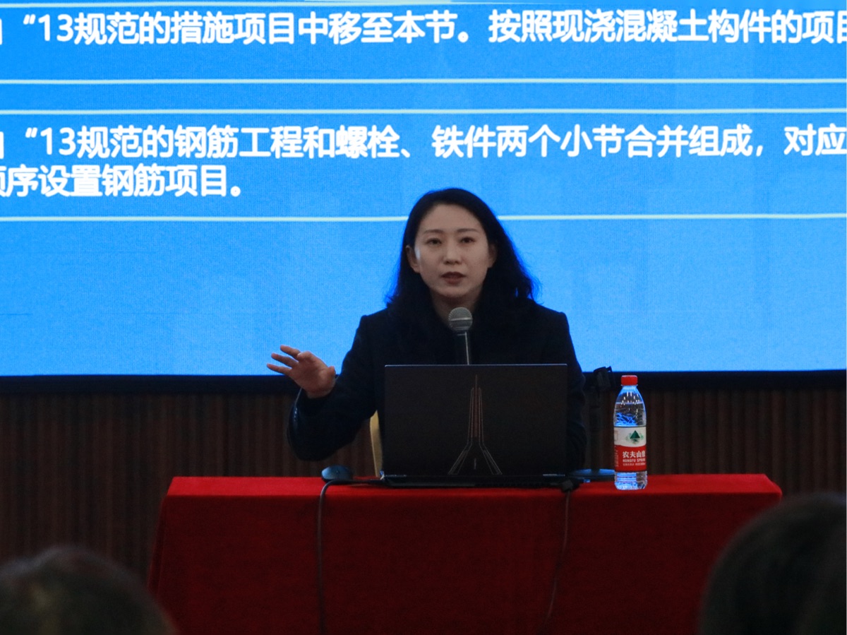 建筑工程学院院长马知瑶围绕《新清单标准下与我省现行定额结合应用要点》展开分享。她从理论到实践,深入剖析了国家标准与地方定额的衔接问题,并提出一系列具有操作性的应用建议,展现了学院在工程造价教育与实践方面的深厚积累。