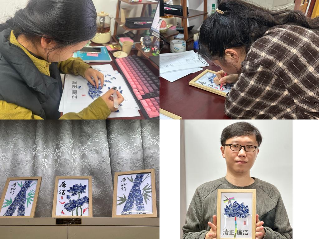 活动现场,陶瓷的微尘与时光交织,大家俯身于方寸工作台前,共同拾起带着岁月温度的瓷片,细心拼贴、精心布局。每一次俯身,都是一次与残缺的对话;每一次粘贴,都是一次对生命韧性的礼赞。值得一提的是,本次活动吸引了众多教师的积极参与,大家化身为陶艺创作的同行者,沉浸于陶韵世界。在师生共同努力下,破碎的瓷片被重新赋予生命。当最后一片瓷片嵌入位置,一幅幅完整的画面在寂静中悄然绽放——那不只是简单的图案,更是“廉心”的视觉叙事,是师生共同创造的价值共鸣。