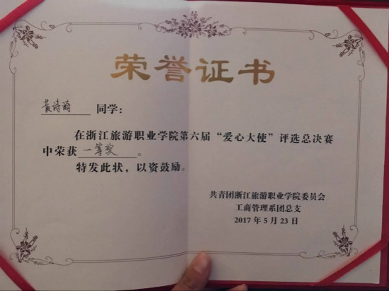 5月23日,水利系学子设施1602学生黄诗琦参加浙江旅游职业学院第六届“爱心大使”活动评选总决赛荣获一等奖,黄诗琦主演的经典创意表演节目《影子秀—欧洲之旅》在文艺汇演中,一鸣惊人,获得各评委和观众的一致好评。