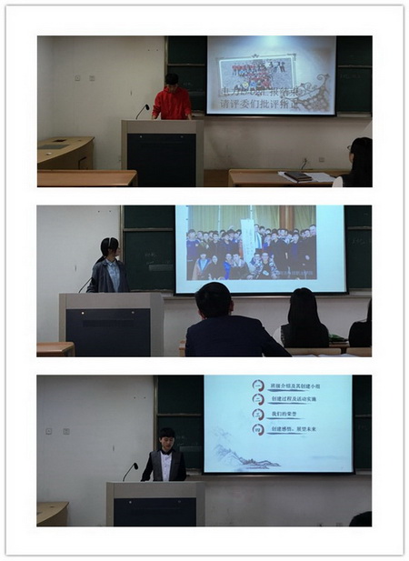 汇报会上,各班级全面总结了2015年12月份,启动创建工作以来班级取得成绩和进步。大家从班级概况、创建目标、创建特色、组织实施、活动开展、取得成绩、创建感悟和展望未来等方面,进行了详细地汇报。在创建活动中,各班级积极开展了寓教于乐、丰富多彩的系列活动,如:创建动员主题班会、缅怀伟人--参观绍兴周恩来故居、学习雷锋精神感恩行动、寒假“八个一”活动、读一本好书、教室、寝室美化布置等等,各种班集体活动的开展,进一步加强了同学们的凝聚力,积极向上的热情。