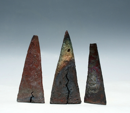 乐烧源于日本,现如今又分为日本乐烧与美国乐烧。余元枫老师采用的是美国乐烧:将掺入10~20%的熟料或匣钵粉的成形坯体进行素烧,素烧后用淋釉、浸釉、喷釉或涂彩等方式施釉。再利用自制的简便乐烧窑烧窑。(自制乐烧窑:在底部镂空的不锈钢筒内围卷附带铁丝网的耐火棉,使其成为窑壁,底座则用耐火砖铺迭而成,中间架以瓦斯喷火嘴……)经过一到两个小时的烧制后熄火,出窑时速用火钳将坯体一个一个挟入放置好碎报纸、干草的有机物铁桶内,桶内有机物被点燃,喷出熊熊大火。待火舌大肆的窜升时,盖上桶盖,进行闷烧还原后丢入水中冷却,最后除去作品表面粘附的碳屑及游离的碳素。如此急速还原的结果,不仅使坯体吸付碳素,呈现浓淡不一富变化的黑色色调,而将釉彩衬托得更鲜丽,另方面也使得釉药里部分的金属氧化物,被还原成纯金属,而在表面形成具有闪光性质的金属膜,颇为光彩炫烂!