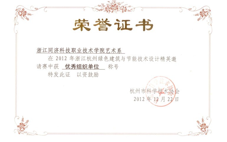 日前,从杭州市科学技术协会传来喜讯,我院学子在德能杯“2012年浙江杭州绿色建筑与节能技术设计精英邀请赛”中再次喜获佳绩。建筑系学生王奇聪同学的设计作品《宁波大学科技学院活动中心》和艺术系学生池银萍等5位同学的设计作品《ZARA服装店设计》荣获金奖,艺术系学生陈若恬同学和建筑系学生王坚同学的设计作品分别获得银奖,同时还有二件作品获得铜奖。艺术系陈旭彤、王蕊、宋扬和建筑系张燕、王涛、张艳共6位老师获得优秀指导老师奖,艺术系获得优秀组织单位奖。