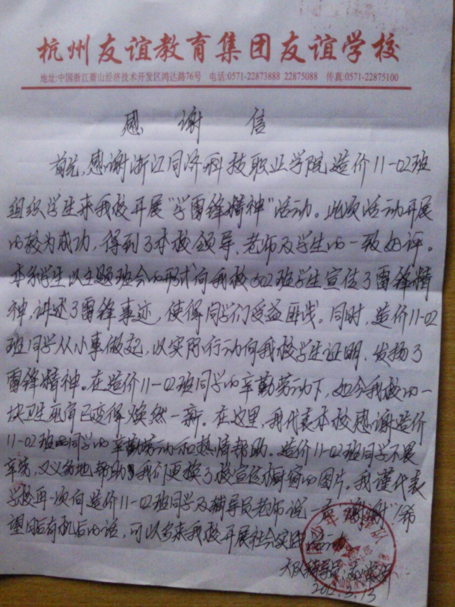参加这次活动的10余名志愿者都来自信息系工程造价11-02班,他们给友谊学校的小朋友们带来了宣传画和宣传册,帮助设计宣传栏,并通过讲故事、做游戏、文艺表演等生动形象的形式来宣传雷锋事迹,以言传身教的方式来宣传雷锋“不怕苦、不怕累”的品质,清理校园内多处卫生死角,令整个校园环境顿时焕然一新,他们还向贫困小朋友们赠送了学习用品和慰问金。志愿者们的表现受到了友谊学校的师生的一致好评,他们还专门写来了感谢信。