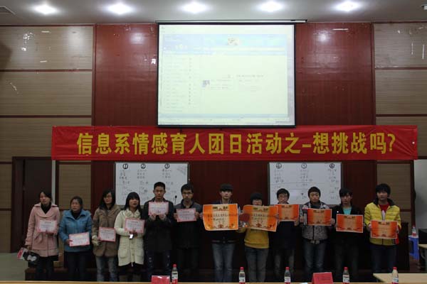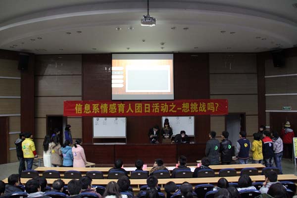 2011年11月至12月,信息系举办了“情感育人”团日活动。日前,决赛在信息楼报告厅隆重举行,信息系全体11届学生及其他各系学生代表参加了本次决赛。