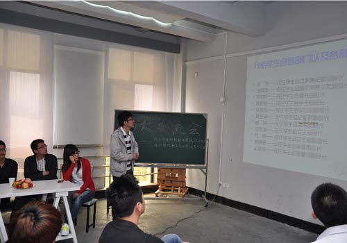艺术系团总支学生会干部陪同来访的老师和学生干部参观了艺术实训楼的作品展,双方学生对展出的设计作品、艺术作品进行了鉴赏。在经验交流会上,双方就学生会的日常工作以及开展的各类特色活动一一作了介绍,除此之外,各个部门还从自身出发,各自介绍了部门的日常情况、开展的活动以及在工作中所遇到的困惑。交流内容各有特色、各有重点,有的结合自身学生工作经历谈经验、有的就服务同学意识谈奉献精神和牺牲精神、有的从多角度谈论学生干部自身价值的建立。