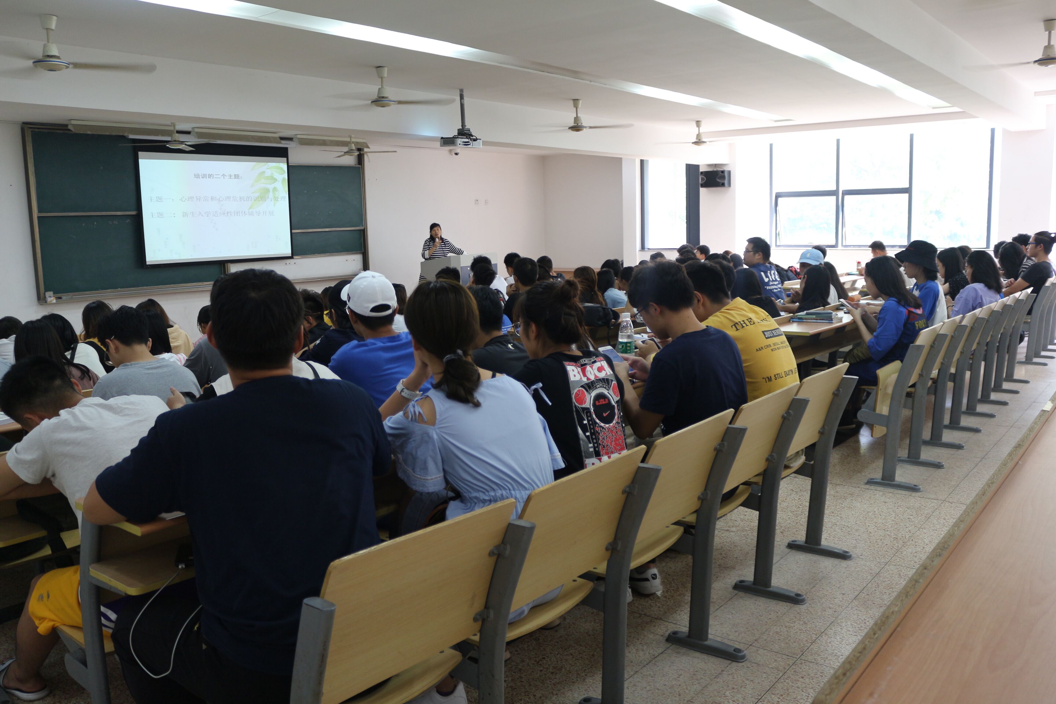 为了加强2018级新生助理班主任的教育和管理,能及时发现和防范所带新生班级同学中的心理问题,掌握心理支持的一般技能和技巧,维护新生心理健康,学工部于9月29日中午组织开展了2018级新生助理班主任心理健康培训工作。培训主讲教师是学院大学生心理健康教育指导中心商冬梅老师,80余名新生助理班主任参加了培训。