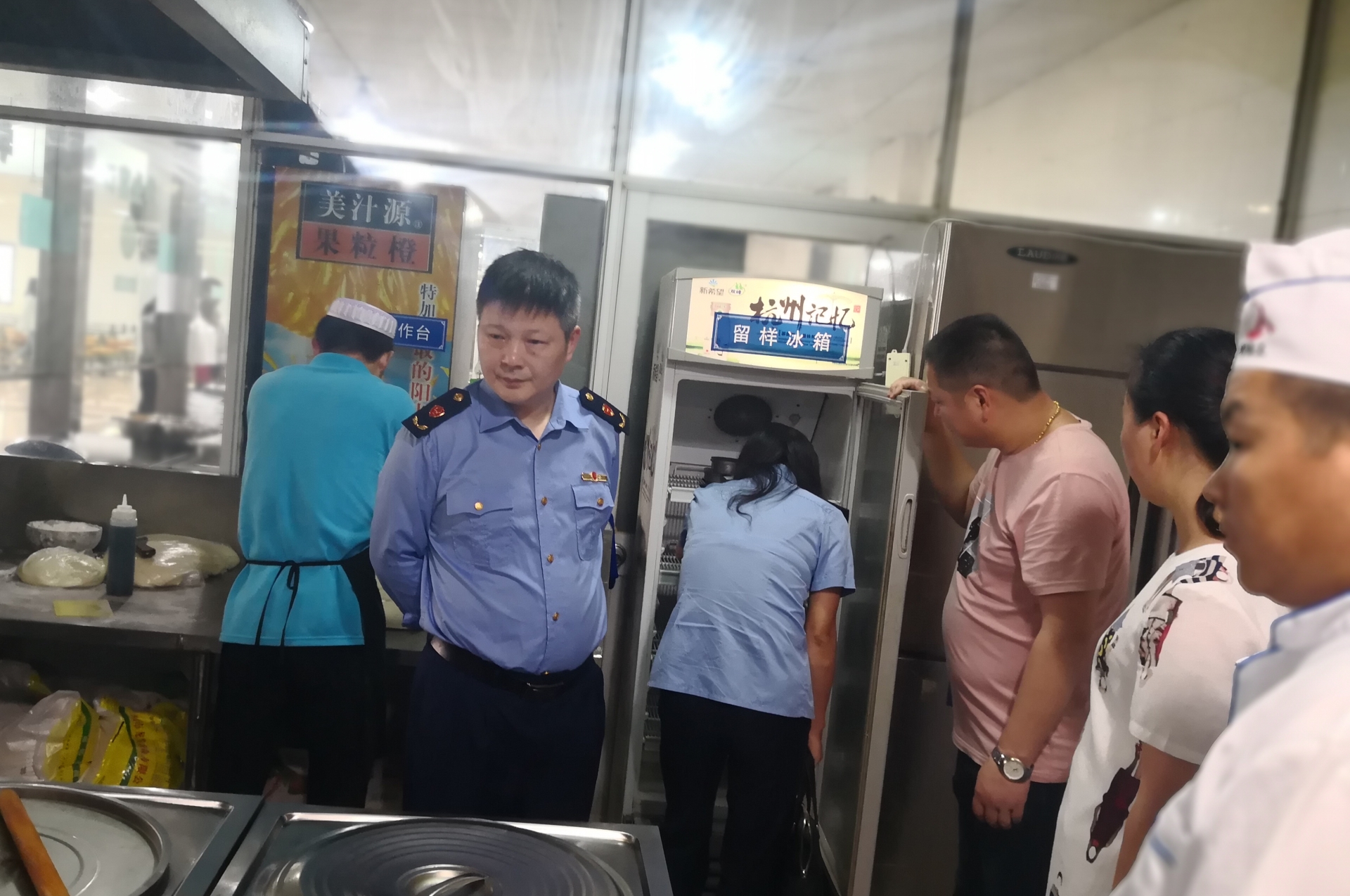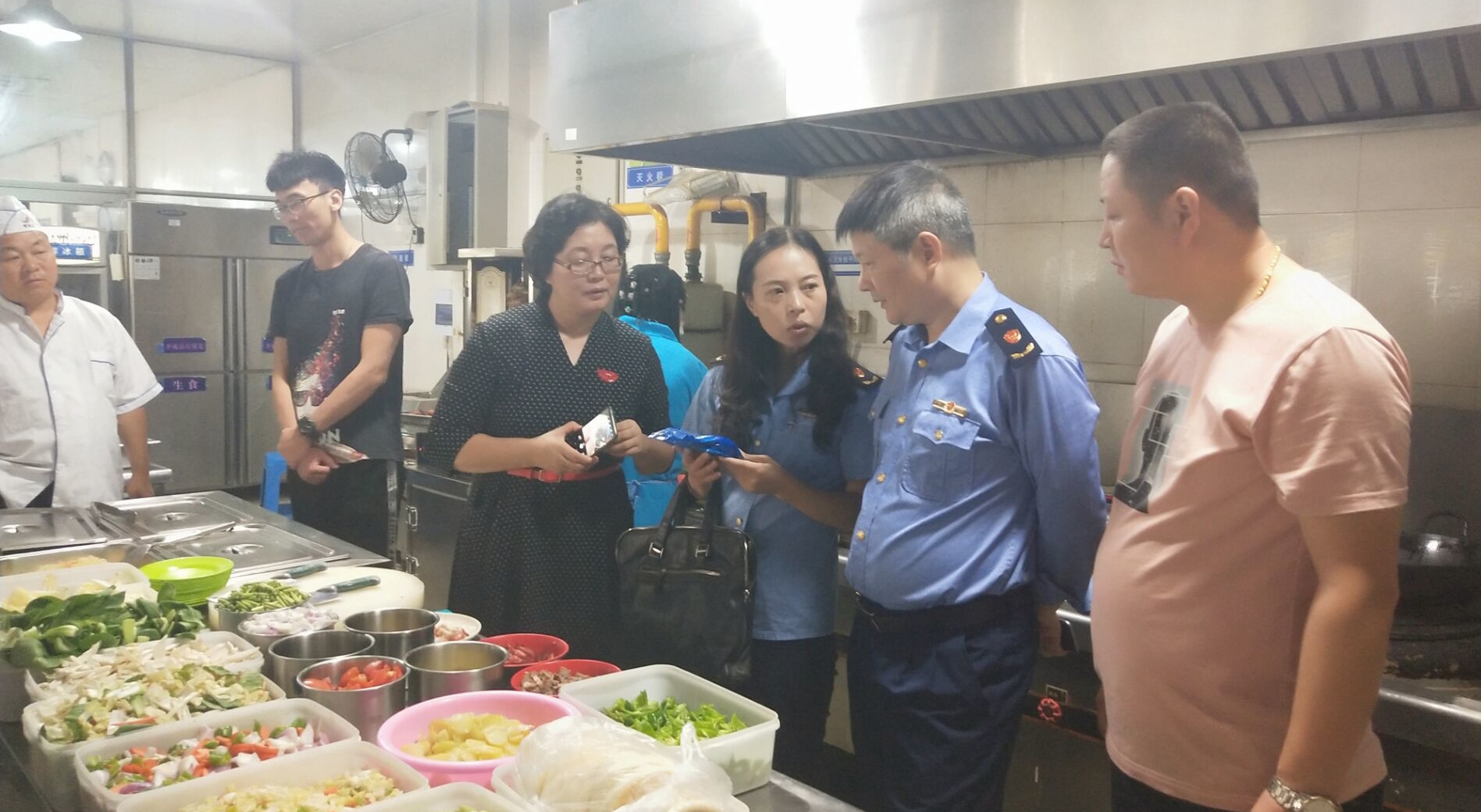 周静一行先后来到学生和教工餐厅,逐一检查了餐厅的各项制度落实情况、操作间环境卫生、食品贮存、添加剂使用、餐饮具消毒、食品留样、农残检测等情况,并就餐厅日常食品原辅材料的索证索票、进货台账登记等进行了详细的检查,对购进的肉制品检疫检验证明、产品合格证明以及餐厨废弃物的收集等进行了重点检查。