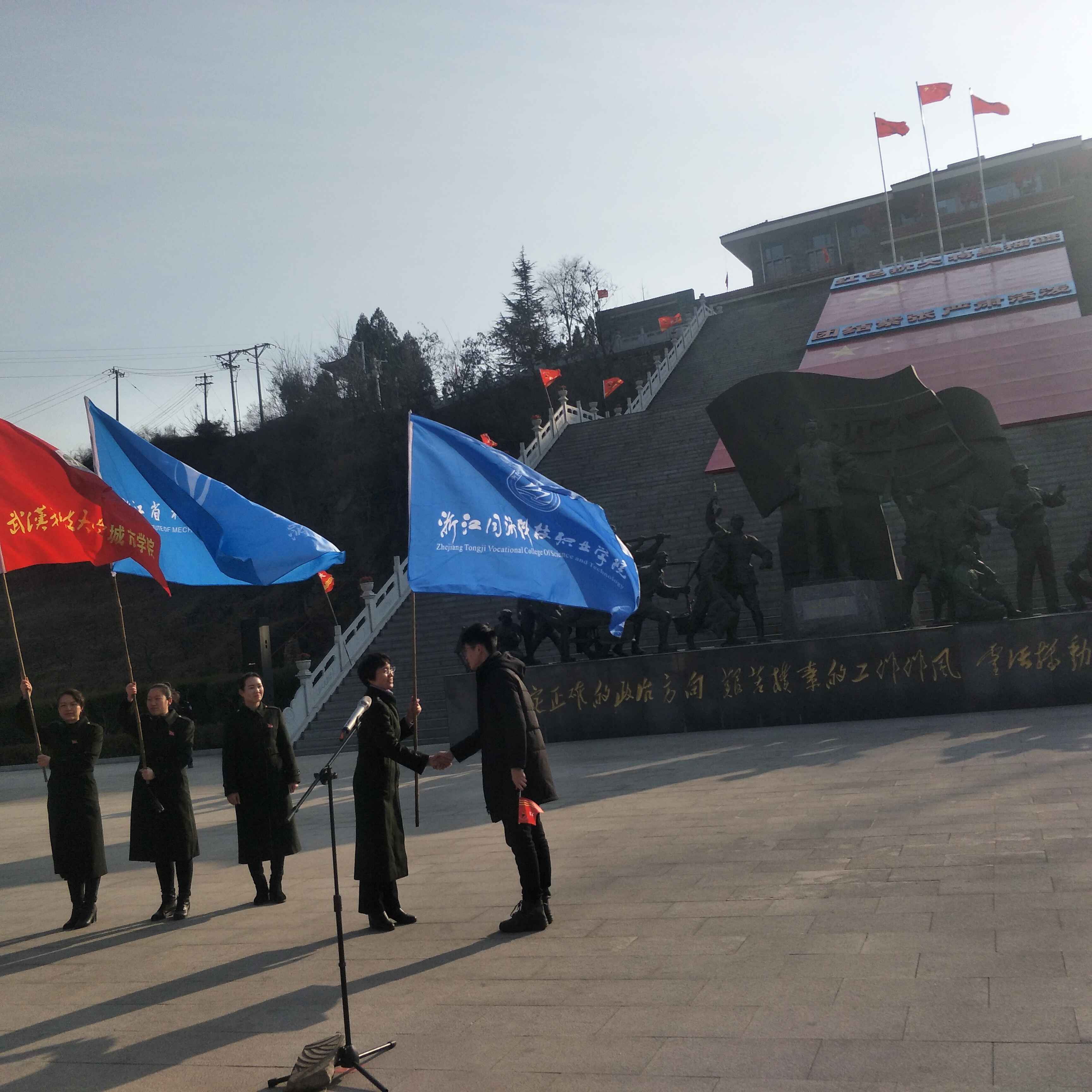 26日下午,参赛师生追随老一辈革命家的脚步行走 “抗大路”,赴抗大陈列馆开展德育教育活动。千名优秀学子齐聚抗大陈列馆广场共同唱响国歌和抗大校歌,我院与武汉科技大学城市学院、浙江省机电技师学院作为学院代表将校旗捐给抗大陈列馆。