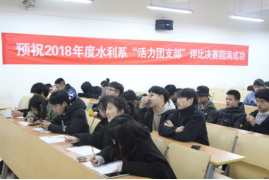 决赛于2019年1月2日晚6时30分在学院信息楼报告厅举行。水利系团总支书记、辅导员张峰老师与水利系主要团学干部出席并担任评委。决赛由水利系团总支组织部胡锦恒主持。决赛由团支书现场汇报、答辩和支部成员风采表演两部分组成。进入决赛的12个团支部在主题团日活动的开展以及组织建设、思想引领等方面都做了大量卓有成效的工作,形成了许多工作上的新突破与新亮点。经过激烈的竞争,最终水利1701团支部与大禹2018团支部脱颖而出,荣获此次大赛的一等奖,水管1701团支部与测量1802团支部获二等奖,测量1701团支部与水工1803团支部获三等奖。