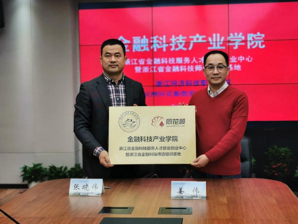最后,姜伟副院长和张晓伟总监分别代表学校和企业签订了校企战略合作协议,并为“金融科技产业学院 浙江省金融科技服务人才就业创业中心暨浙江省金融科技师资培训基地”授牌。
