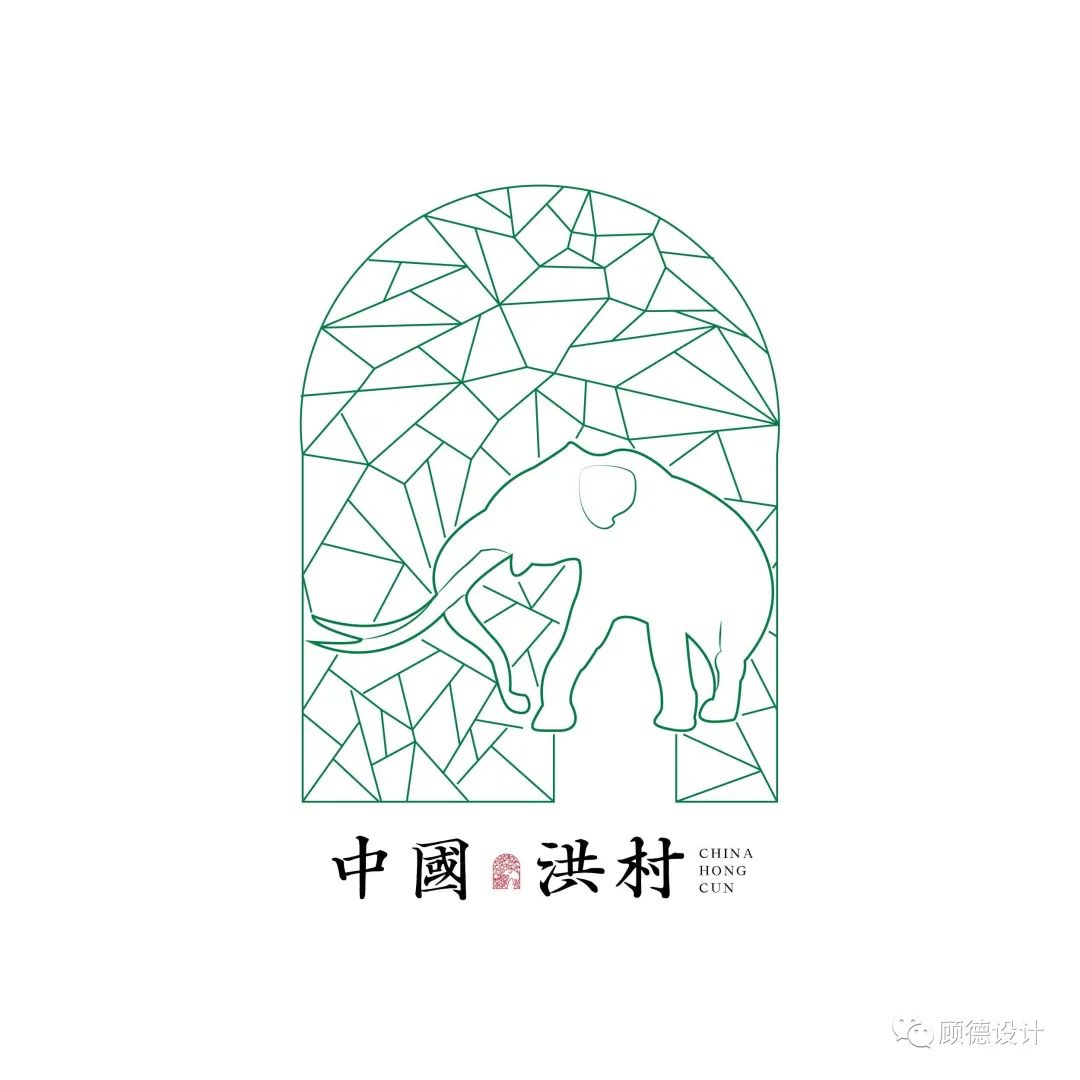 洪村在马金镇,隶属于浙江省衢州市开化县,位于开化县北部,是钱塘江源头,是“千岛湖-黄山”黄金旅游线上的重要节点。在洪村当地的山洞里发现了一些剑齿象和中国犀的牙齿,省自然博物馆副馆长、著名古生物化石专家金幸生博士,省自然博物馆安全保障部主任张江龙和县文物所所长陆苏军等专家推断,这个洞里可能还会有大熊猫、牛、野猪等动物的化石。洪村文化礼堂将打造化石陈列馆,通过馆里的展品、展板,使人们更深切地了解洪村悠久的历史和深厚的文化底蕴,洪村也积极准备申报国家地质文化村。本次标志设计的灵感就是取自洞中之剑齿象的原型抽象而来。