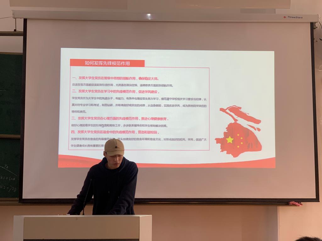 学生党员、系团学组织部部长胡潮峰通过一组图领学十九届五中全会精神。从十九届五中全会议程,“十四五”规划的重要意义,“十四五”规划的总目标以及所涉及的主要内容等方面进行了解读。并通过学习强国平台,组织大家观看了十九届五中全会相关的宣讲视频,使同学们深刻体会到有了学习强国平台,可以随时随地学习当前新知识、新理论,更深入领会十九届五中全会精神。