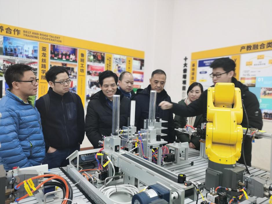 亚龙智能装备集团有限公司陈昌安副总经理和周炜副总监陪等领导陪同参观了亚龙集团的考核鉴定场所和智能制造展厅、电梯实训及考核鉴定中心。陈昌安副总经理详细介绍了企业总体情况和校企共建实训室的建设规划,金永琪主任介绍了学院及机电系基本情况,座谈会上双方进一步深入国际交流、校企合作的实施途径。随后,董事长陈继权介绍了公司发展愿景,并进一步表达了创新校企合作机制的意愿。