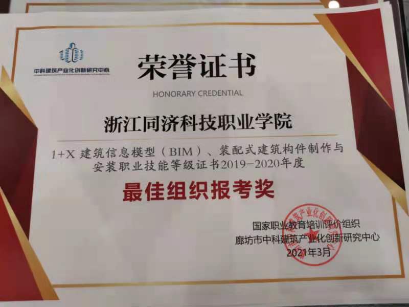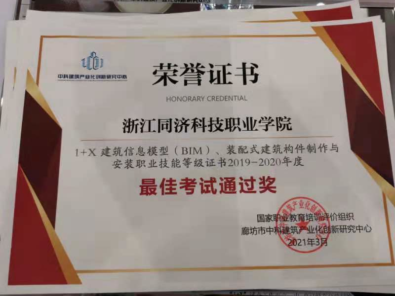 在2021年3月20日召开的廊坊中科年度工作会上,由于在2020年度1+X建筑信息模型(BIM)和装配式建筑构件制作与安装职业技能等级证书制度试点工作中的优异表现,我校获得最佳组织报考奖和最佳考试通过奖,也是我省唯一一所包揽两个奖项的学校。