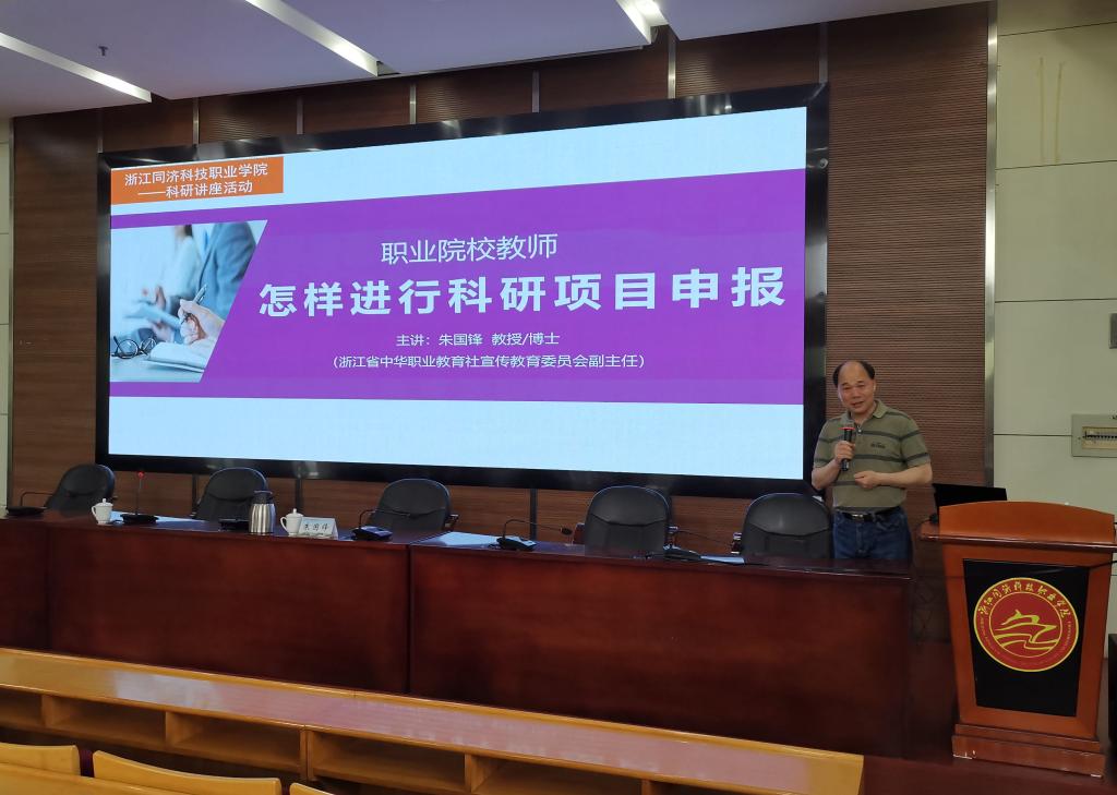 2021年5月8日上午,浙江省中华职教社宣传教育委员会副主任朱国锋教授应邀到校作了题为《怎样进行科研项目申报》的学术讲座。学校科研处处长高永胜主持讲座,学校80余名教师参加了本次讲座。