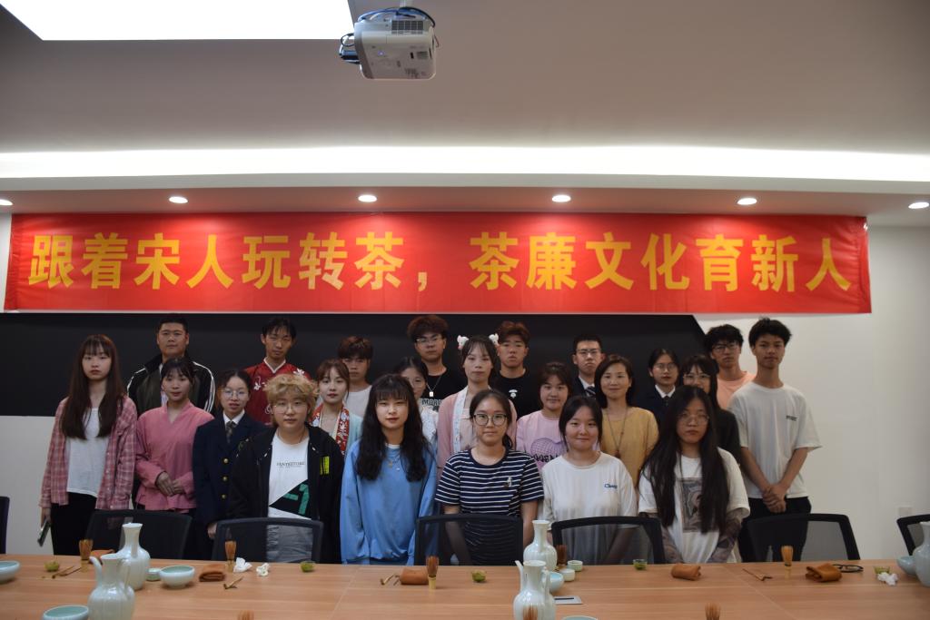 揭牌仪式之后,毛教授为在场的学生们授课,讲解了茶廉文化的深刻内涵,通过一个个生动形象的故事阐述了点茶的历史渊源,引导同学们在品茗的过程中调整心态,重新认识自己,感悟人生哲理。学生代表身穿古装,遵循宋代点茶仪轨,用三汤法演示了点茶的详细步骤备器、候汤、习茶,边演示边讲解,为参与者展现了一场视觉及文化盛宴。在毛老师的指导下,同学们体验了宋代点茶的各个步骤,学习了以茶为媒的生活礼仪,了解历史中人们的审美和生活追求,以“茶廉文化”为主题,绘制了茶百戏。