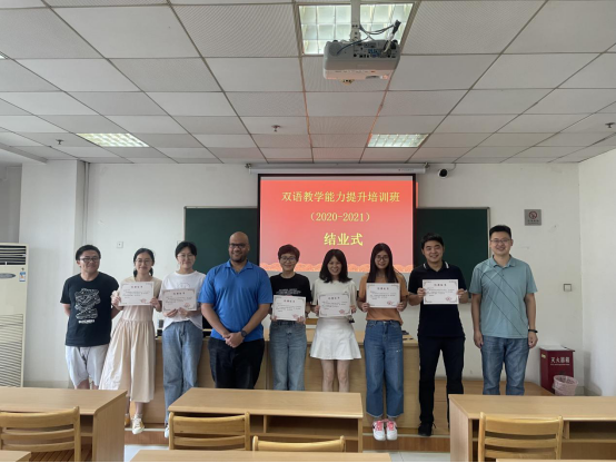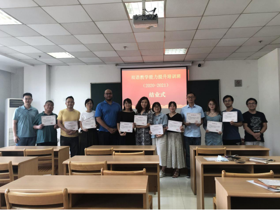 为了提高教师双语教学能力,打造高水平师资队伍,助推学校“双高”建设,2020年9月至2021年6月,学校人事处(教师工作部)、教师教学发展中心、教务处(国际交流中心)共同举办了双语教学能力提升培训班(第一期卓越班、第二期菁英班)。2021年6月23日下午,培训班在行政楼201教室举行结业式。结业式由人事处副处长胡玉君主持。