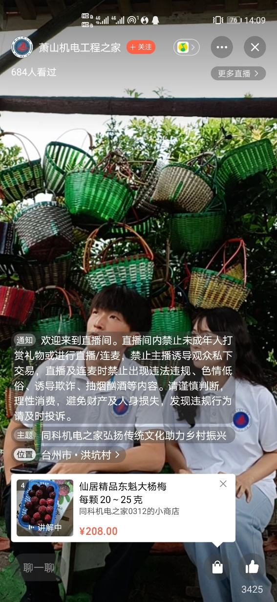 直播开启,志愿者们详细介绍了仙居当地特产“东魁杨梅”,绘声绘色的讲解引起了极好的反响。直播气氛活跃,粉丝反响十分热烈,同时也创下了令人骄傲的营业额,也向当地农户展示了数字经济时代新型销售手段带来的销售力。