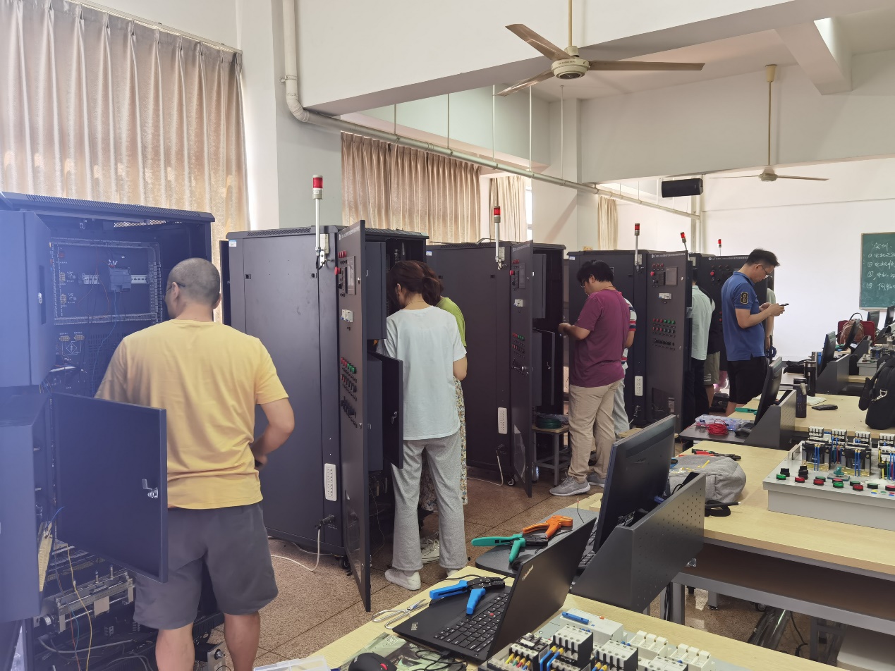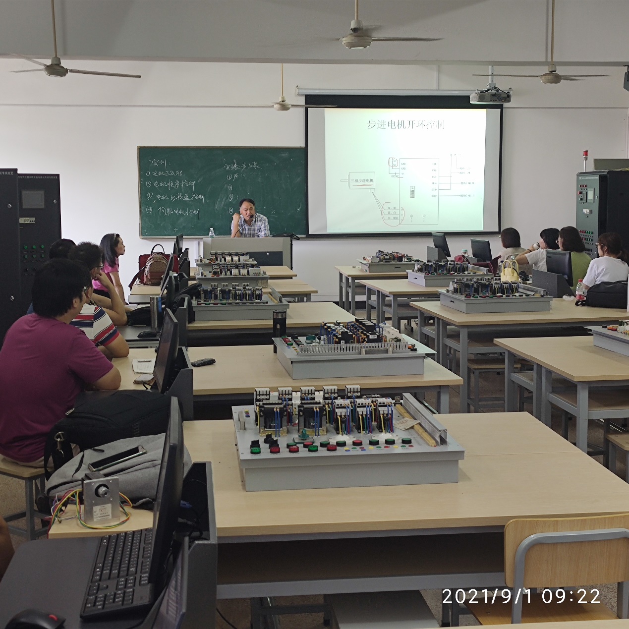 电气自动化、机电一体化、数控技术、电梯工程、发电厂与电力系统等专业的十六名专任教师参加了本次内训,电气自动化专业带头人、专业部主任蒋元星负责本次内训授课。课程包括步进电机、伺服电机与PLC控制、PLC通讯、计算机控制与组态、智能工厂参观、总结交流等内容。内训课程按照一体化教学模式开展,参训教师积极动手训练:做线头、接线、编程、下载、调试,学得不亦乐乎。机电工程学院高度重视提升教师教学技能,连续两年暑假安排专任教师的暑期内训,通过召开新教师座谈会、组织教师教学能力大赛、开展日常教研等活动,不断促进教师教学能力提升。