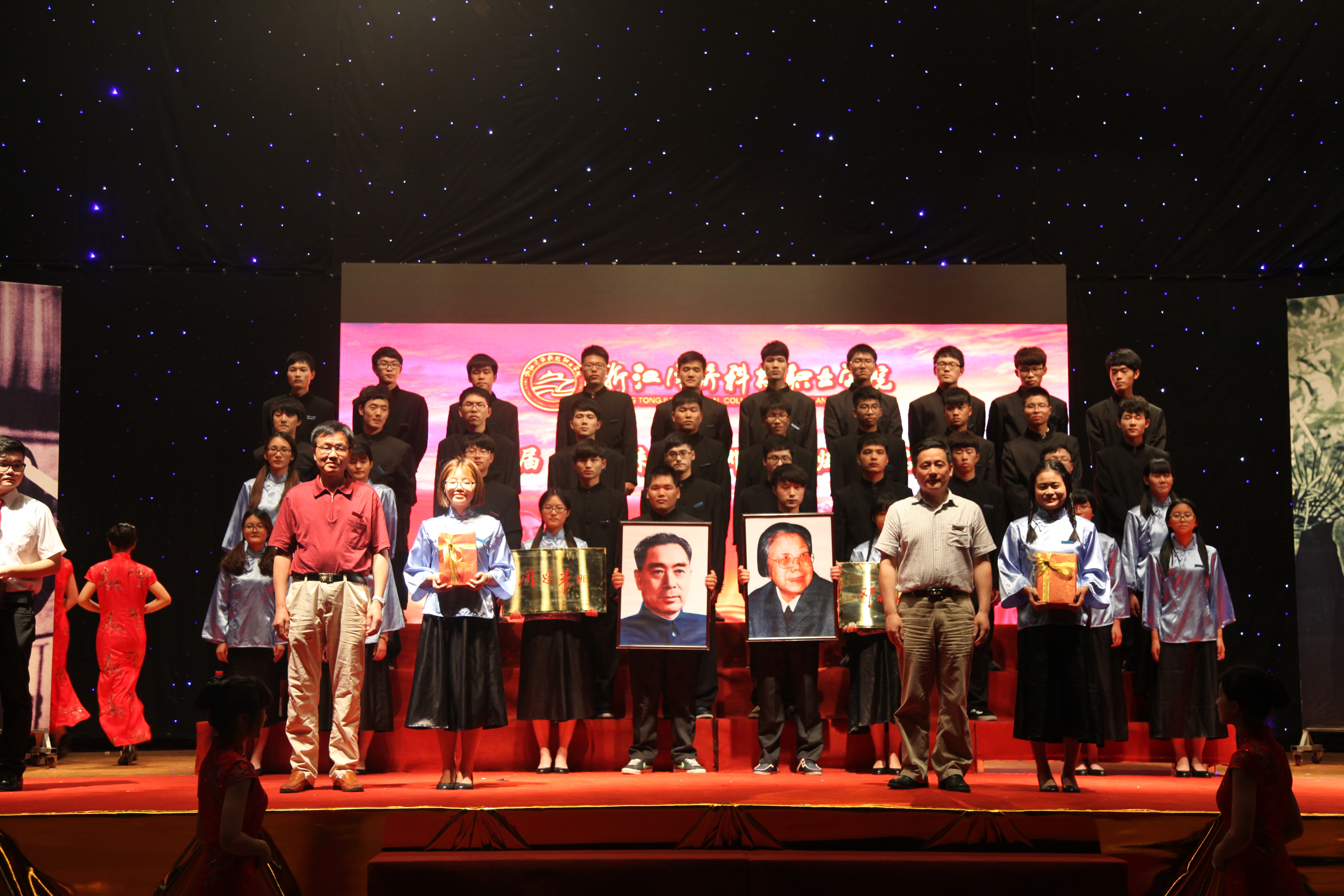 6月11日下午,学院第七届“周恩来班”“邓颖超班”命名仪式召开。学院全体院领导出席仪式。学院科级及以上中层干部、全体辅导员、班主任及学生代表1000余人参加命名仪式。 命名仪式分为场外、场内会场,场外首先进行了历届“周恩来班、邓颖超班”名录碑揭幕,学院党委书记丁坚钢、学院院长梁国钱为名录碑进行了揭幕,随后与会领导和嘉宾移步文体中心场内进行命名仪式。仪式开始,全体在场人员向舞台上树立的周恩来及邓颖超像深深一鞠躬,以缅怀伟人的精神。学院院长梁国钱宣读了院党委《关于命名第七届“周恩来班”、“邓颖超班”的决定》。经过层层选拔评定,决定命名大禹2014班为学院第七届“周恩来班”,命名建筑工程技术14-02班为学院第七届“邓颖超班”,并授予会计与审计14-01班、汽车制造与装配14-01班、装饰艺术设计14-01班为第七届“周恩来、邓颖超班”创建奖荣誉称号。与会领导向获得命名及创建奖荣誉的班级授铜牌、赠送伟人像及纪念章,第七届“周恩来班”班长上台发言并宣誓,获得第七届“周恩来班、邓颖超班”命名的班级全体成员发出了“牢记先辈教诲,本本分分做人,秉承伟人精神,共创和谐班级”的庄严宣誓。 院党委书记丁坚钢代表学院致辞。他对荣获第七届“周恩来班”“邓颖超班”及创建奖的班级表示热烈的祝贺。他指出,周恩来精神是中华民族精神宝库中一个璀璨夺目的丰碑,是我们取之不尽的精神财富。学院积极开展“周恩来班、邓颖超班”创建活动,就是要学习和弘扬伟人精神,引导广大学生学习周恩来同志的崇高品质,研究周恩来同志的革命精神,将周恩来精神具体融入到广大学生生活实际,引领广大学生践行周恩来精神,树立远大的人生理想,勤奋学习,立志报效祖国。 “周恩来班、邓颖超班”创建活动是学院的一种特色的思想政治教育载体,是学院班级建设活动的最高荣誉,创建活动弘扬爱国主义传统,旨在通过伟人精神育人,达到以德育才的效果。近年来,学院德育工作水平和师生思想道德素质不断提高,学生党员人数逐年增加,引导师生践行“厚德、笃学、修能”的校训,有力地推进了校风、学风的建设,努力构建和谐校园!