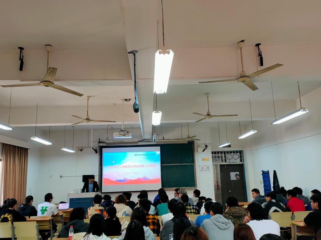 进一步开展马克思主义宗教观的宣传教育,引导广大青年学生正确认识和待宗教,了解党的宗教政策,1019,由我校马克思主义学院、学工部共同主办的同科大学堂第四十三讲“马克思主义宗教观与党的宗教工作策略” 讲座在A503教室举行。学校党委委员、宣传部长吴敏启、马克思主义学院副院长阮红芳、基础直属党支部张春平副书记、学工部穆晓辉副处长、马院教师、部分辅导员及学生代表聆听讲座。